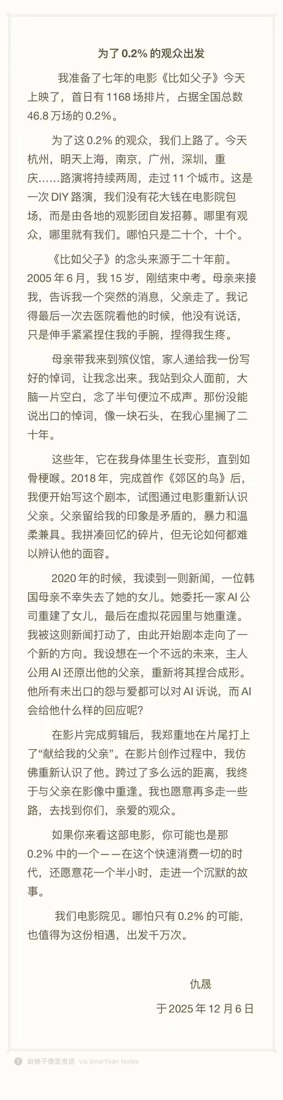 面对如此心寒的市场冷遇,导演仇晟用长文大发感慨。他第一段就直面惨淡的排片“我准备了七年的电影《比如父子》今天上映了,首日有1168场排片,占据全国总数46.8万场的0.2%。”