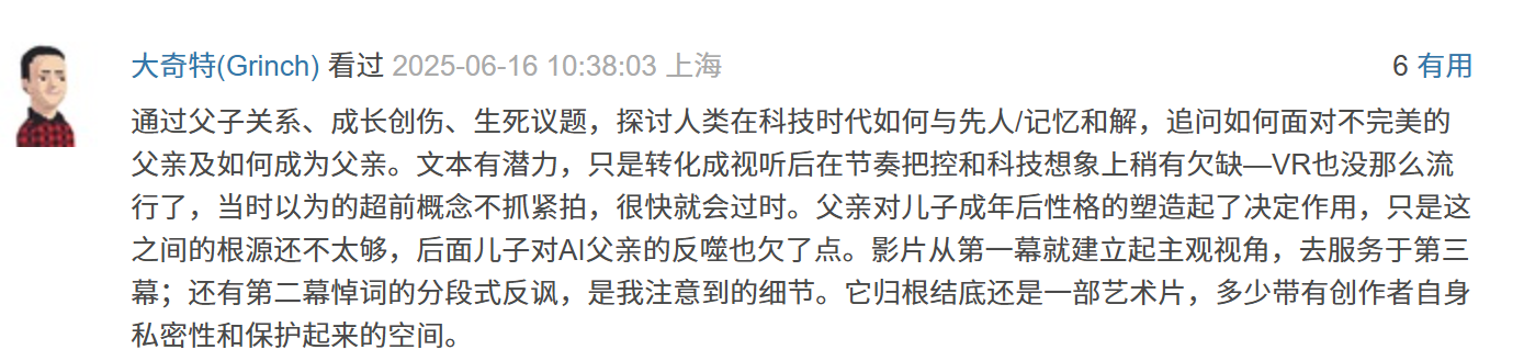 通过父子关系、成长创伤、生死议题,探讨人类在科技时代如何与先人/记忆和解,追问如何面对不完美的父亲及如何成为父亲。文本有潜力,只是转化成视听后在节奏把控和科技想象上稍有欠缺,VR也没那么流行了,当时以为的超前概念不抓紧拍,很快就会过时。父亲对儿子成年后性格的塑造起了决定作用,只是这之间的根源还不太够,后面儿子对AI父亲的反噬也欠了点。影片从第一幕就建立起主观视角,去服务于第三幕;还有第二幕悼词的分段式反讽,是我注意到的细节。它归根结底还是一部艺术片,多少带有创作者自身私密性和保护起来的空间。